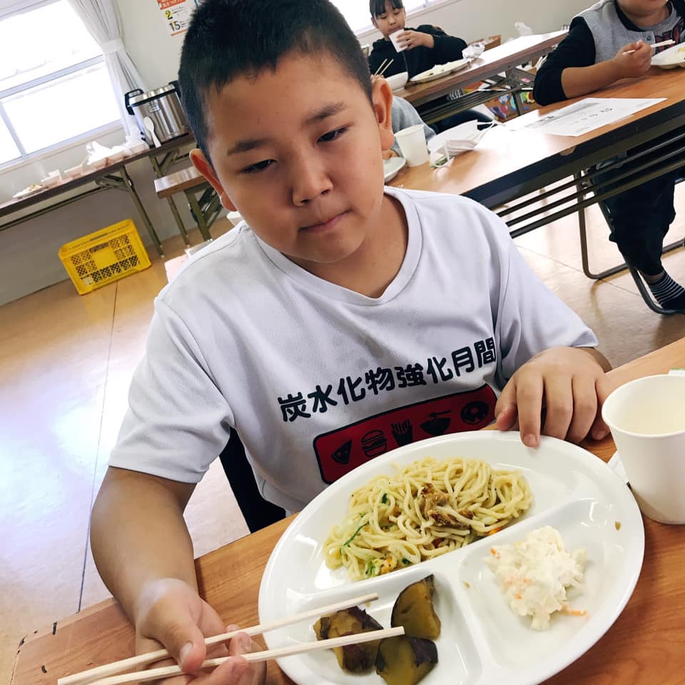 沢山の支援品もいただき、シーフード塩焼きそばとごはん畑の学校で掘ったお芋の煮ものポテトサラダ松茸スープをご用意しましたー♪