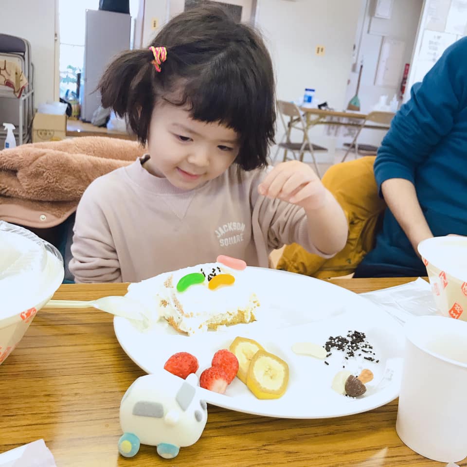 生クリームやフルーツをそれぞれにトッピングしてもらってオリジナルデコケーキを作って楽しく食べました♪