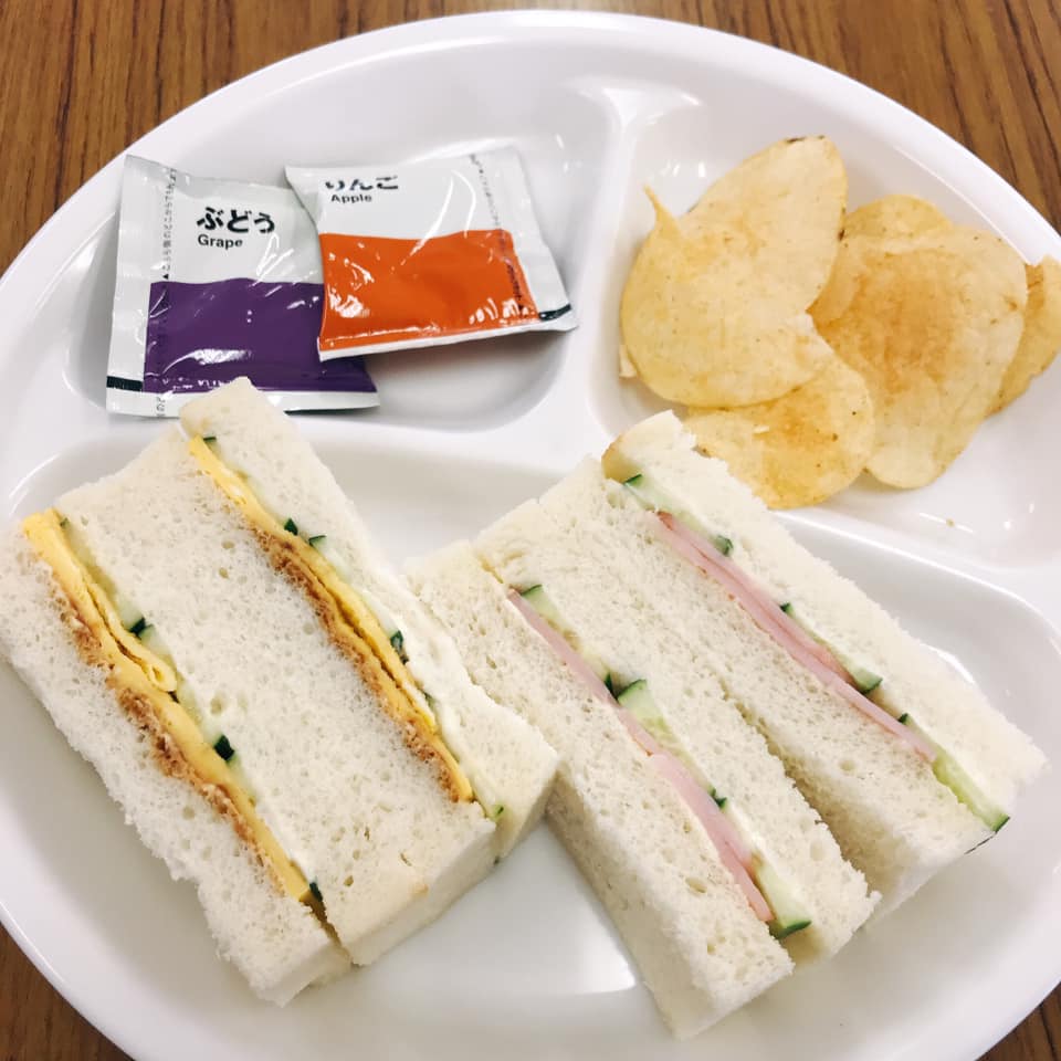 タマゴ(薄焼き)サンドとハムサンド、ポテトチップスを添えて・・・