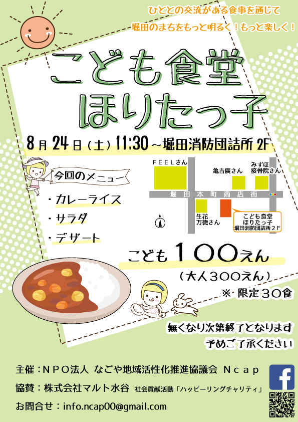 2019年8月24日(土)、前回と同じく名古屋市瑞穂区の堀田本町商店街にて子ども食堂を開催します。